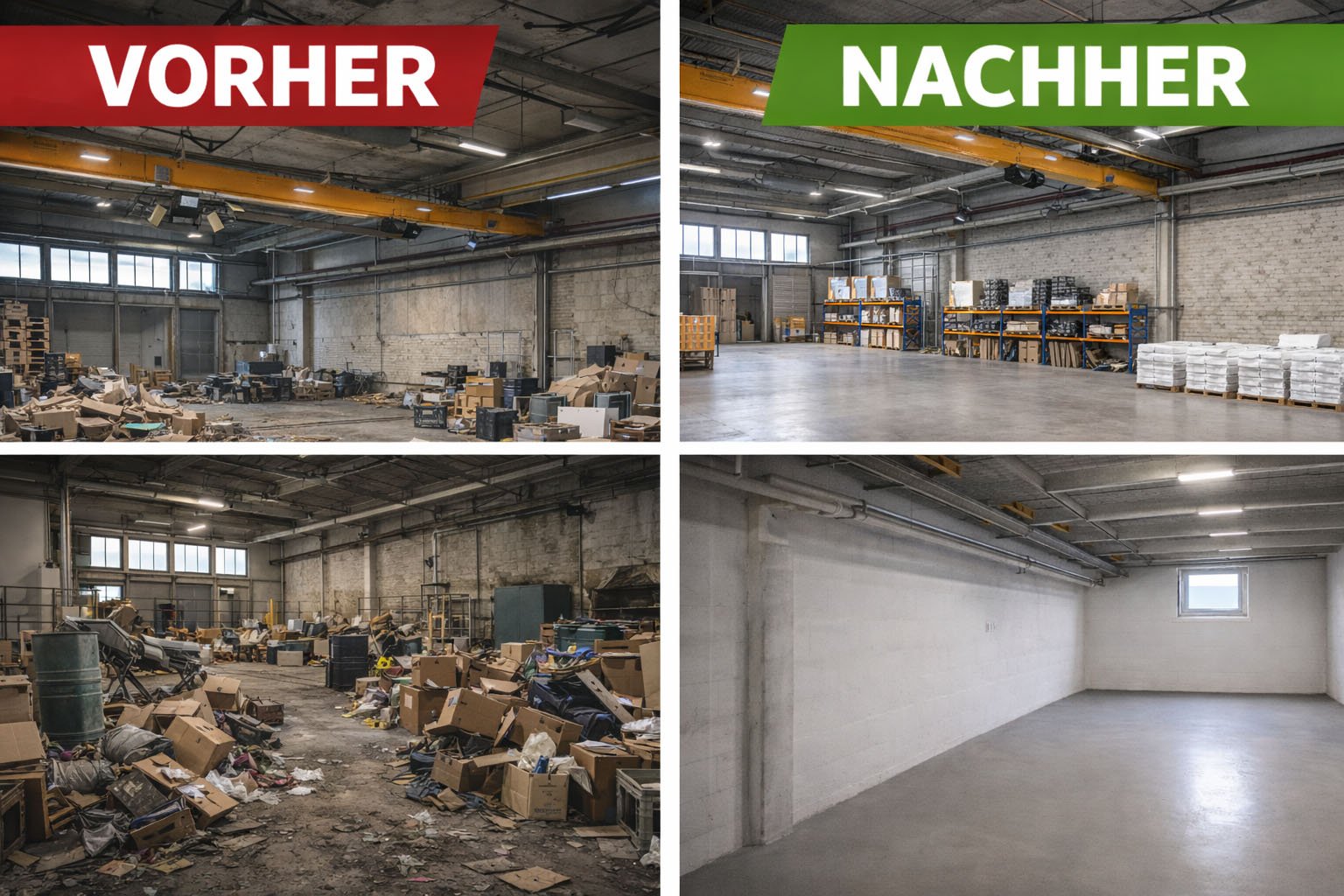 Wir übernehmen professionelle Industrieräumungen für Hallen, Lager, Produktionsflächen und Gewerbeobjekte. Maschinen, Anlagen und Materialien werden fachgerecht demontiert, transportiert und entsorgt – effizient, sicher und termingerecht.