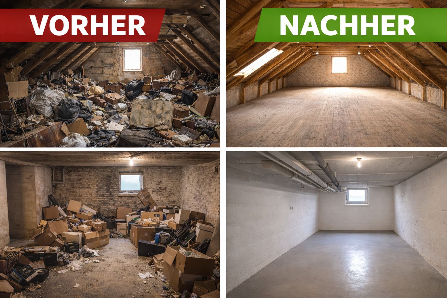 Wir räumen Wohnungen, Keller, Dachböden, Büros und komplette Immobilien. Auf Wunsch übernehmen wir auch die fachgerechte Entsorgung und gründliche Reinigung – alles bequem aus einer Hand.